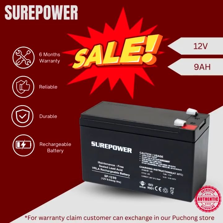SUREPOWER Maintenance Free Sealed Lead Acid Battery (12V 9AH) UPS/ Automatic system/ PABX system/ fire alarm/ emergency lightning/ alarm system